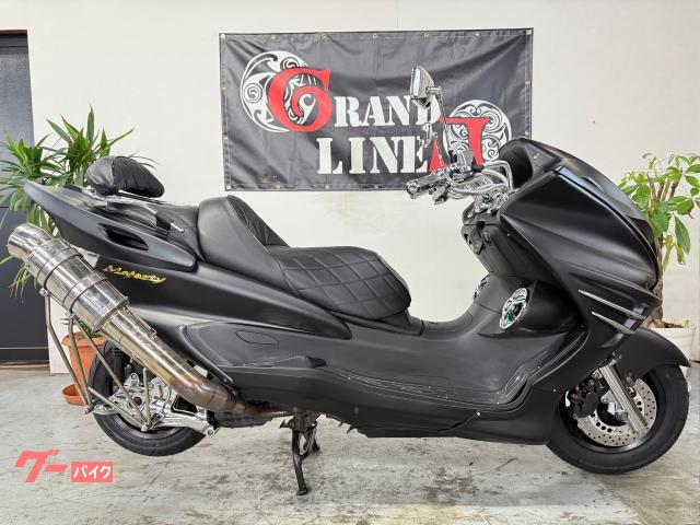 ヤマハ マジェスティC カチアゲマフラー・エアクリ LED4スピーカー プロジェクターヘッドライト タイヤ前後新品 マッドブラックカスタム 車両価格 41.8万円(税込10%)
